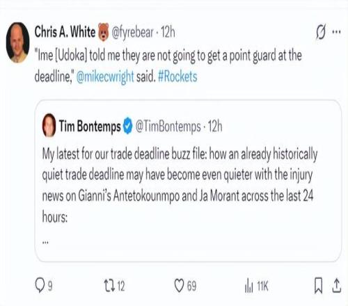 但火箭队记克里斯-怀特转推后回复:乌度卡告诉我,在本赛季交易截止日前他们不考虑引进一个控球后卫。