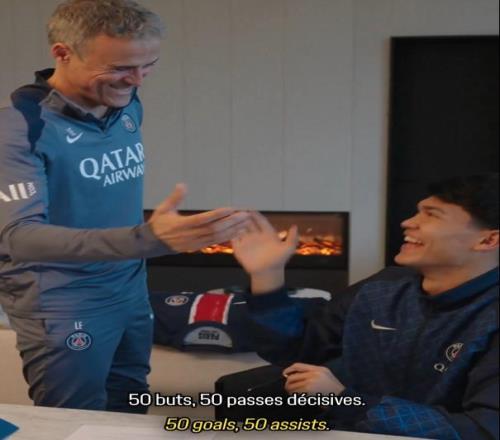 当德罗-费尔南德斯在合同上落笔后,现场响起阵阵掌声。此时,恩里克走上前去,指着签约文书上的签名对德罗调侃道:“在此签下:50个进球,50次助攻。谢谢。”