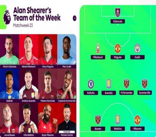 1月27日,英超官方公布了阿兰-希勒评选的第23轮比赛的最佳阵容,其中西汉姆联有3名球员入选,曼联、维拉各有两人,主教练为卡里克。