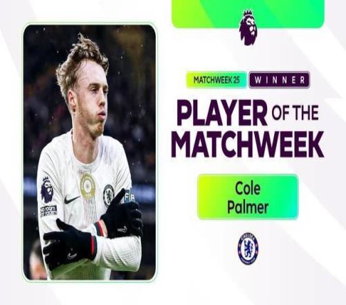 切尔西攻击手科尔-帕尔默在球队3-1客胜狼队的比赛中发挥惊艳,当选英超第25轮最佳球员。