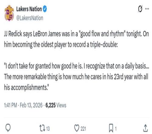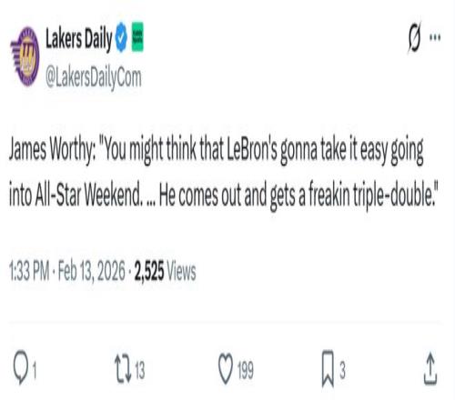 面对詹姆斯如此傲人的表现,湖人名宿沃西感叹道:“当你认为詹姆斯可能会在全明星周末到来之际放松一下时,结果他一上场就拿了个三双。”