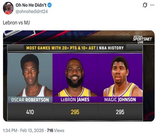 纪录三:本场是詹姆斯生涯第295次单场至少交出20分10助,成功追平魔术师约翰逊并列NBA历史第二,大O以410次高居历史第一。