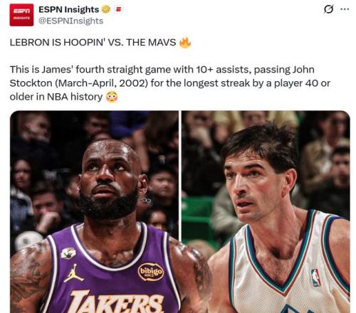 纪录一:本场是詹姆斯连续第4场助攻数上双,成功超越NBA助攻王斯托克顿,刷新NBA历史上40岁及以上球员助攻连续上双场次最长纪录。