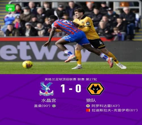 北京时间2月22日英格兰足球顶级联赛 联赛 第27轮,水晶宫主场对阵狼队。水晶宫盖桑破门。最终比分水晶宫 1-0 狼队。