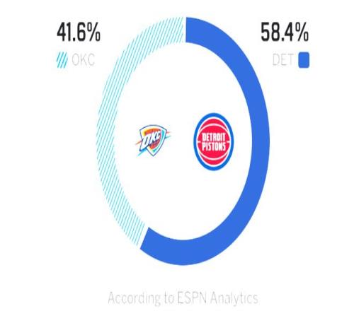 北京时间2月26日,NBA常规赛迎来活塞与雷霆的比赛!主场作战的活塞,赛前以42胜14负稳居东部第一。上一场与西部第二马刺的强强对决中遗憾输球,五连胜被终结,此役杜伦对位文班亚马砍下25分14篮板表现不俗,但核心坎宁安26投5中仅得16分10助攻,状态低迷导致球队失利,这也暴露出年轻球队在高端局中的状态不稳。反观雷霆,赛前以45胜14负仍稳居西部第一。昨天雷霆以残阵116-107击败猛龙,豪取三连胜,虽然亚历山大和杰伦威缺阵,但卡森华莱士轰下全场最高的27分,以赛亚乔、多特、卡鲁索均表现不俗。本场是联盟榜首之争,活塞如果输球,雷霆重回联盟第一,杜伦和坎宁安必然会借助主场的优势发力拿下比赛!美媒ESPN预测本场比赛,雷霆胜率41.6%,活塞胜率58.4%。