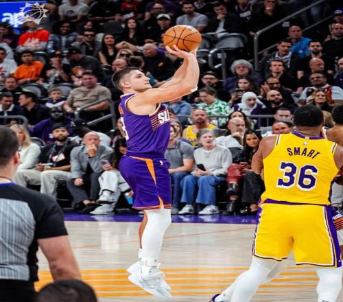 东契奇无愧联盟首节之王,开场有体能时的确无懈可击,单节7中5拿到12分,詹姆斯则3中2拿到5分,湖人的进攻主要就是依靠这两人,里夫斯只拿到2分。因为残阵太阳缺少了布克、狄龙两个主要得分点,杰伦-格林忌惮自己的腿筋伤势不敢突破,替补席的阿伦连续命中三分成为第一进攻点,首节打完湖人27-22领先。