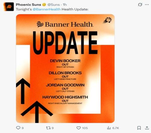 太阳这边布克、狄龙、古德温、海史密斯都无法登场。