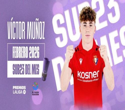 奥萨苏纳中场维克托·穆尼奥斯的表现日益成熟,二月的发挥更是印证了他的成长。这位23岁的球员凭借着帮助球队在整个二月保持不败的统治级表现,当选西甲联赛二月最佳U23球员。