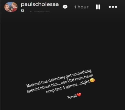 斯科尔斯写道:“迈克尔(卡里克)身上肯定有某种特别之处。因为曼联最近4场比赛表现简直烂透了,晚安,托纳利!”