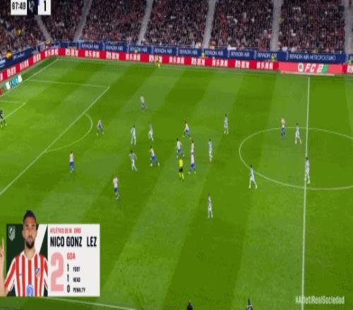 第67分钟,格列兹曼脚后跟妙传,尼古拉斯-冈萨雷斯破门,马竞2-1!