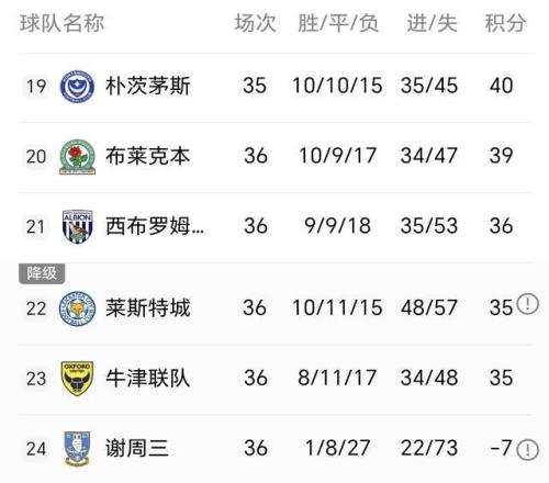 此战过后,莱斯特城遭遇10轮不胜,36轮比赛10胜11平15负,仅积35分位列英冠第22,也就是联赛倒数第3!