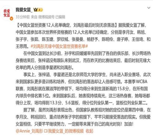 不少球迷为刘禹彤落后12人名单感到可惜和不平。在大多数球迷看来,现阶段刘禹彤的能力显然比入选12人名单的张子宇要强,实用性也比后者大。有人总认为张子宇以后还会提升,其实她已提升不了多少了,也不要说她现在只是19岁,当年郑海霞17岁就打世界大赛了。张子宇进入国家队也有两年了,你看她有进步吗?可以说一点进步也没有,仍然是像过去那样站着接球,站着双手放篮(而不是投篮)什么转身啊,跑动接球啊,背打啊,运球啊,统统没有。