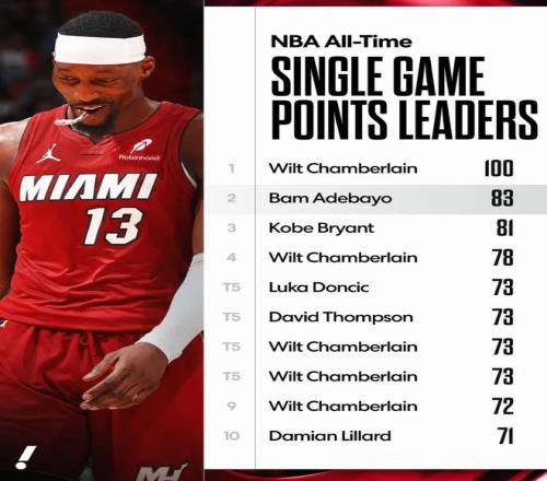 单场83分,也让阿德巴约成功超越科比的81分,登上NBA历史单场得分榜第二位,仅次于张伯伦(100分)。