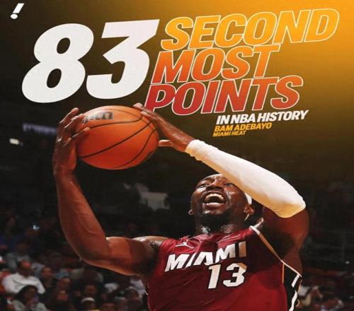 在热火以150-129战胜奇才的比赛中,热火球星阿德巴约状态神勇,登场42分钟,43投20中爆砍83分,另有9篮板3助攻2封盖进账。