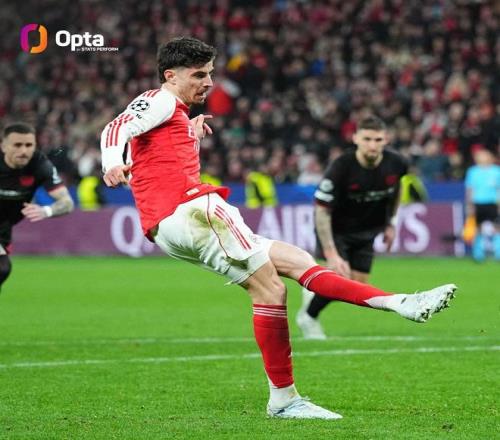 欧冠1/8决赛首回合,阿森纳客场1-1战平勒沃库森,哈弗茨在比赛第89分钟罚入绝平点球,据统计,这是阿森纳自2010年3月以来在欧战最晚打入的点球。
