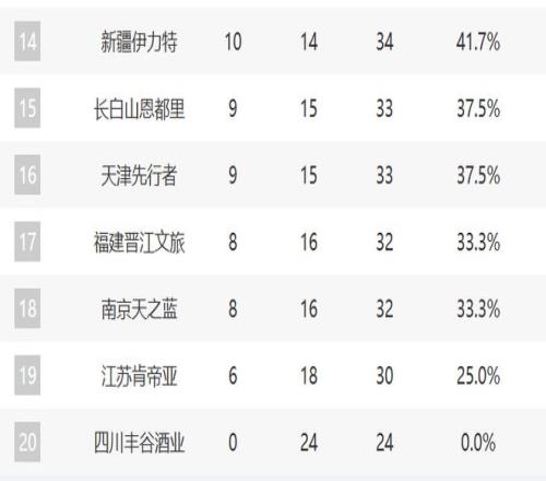 14-20分别是新疆、吉林、天津、福建、同曦、江苏和四川。新疆这轮击败了广东,目前防守的调整已经越来越好了,进攻端的发挥也不错,他们依然有希望直指季后赛。但吉林输给山西,战绩持续下滑。天津则保持了两连胜,他们有点复苏的意思了。至于福建和江苏都是连败,同曦这轮输给广厦,这三支球队好像距离季后赛渐行渐远了。四川现在已经24连败了。
