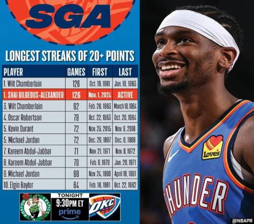 这记中投可不简单,帮助亚历山大超越张伯伦(连续126场20+),达成了连续127场20+成就,NBA官方及各大媒体也第一时间晒图庆祝。