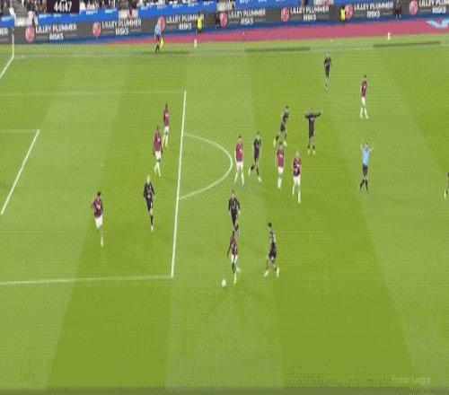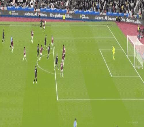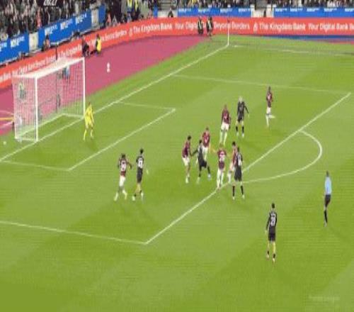 第27分钟,努里强行传中,西汉姆联两名防守球员起跳晃点了哈兰德,哈兰德的头球没能顶正部位。