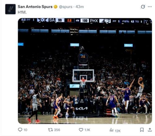 北京时间3月20日,圣安东尼奥马刺队101-100险胜菲尼克斯太阳队。这场比赛太阳算是被逆转的,太阳一度领先马刺11分之多,可在终场前1.1秒被维克托-文班亚马的超级后仰跳投绝杀了,太阳还没有暂停只能后场发球无力回天。