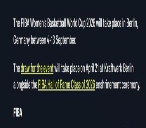 宣布2026年女篮世界杯正赛将于9月4日至13日在德国柏林开始。
