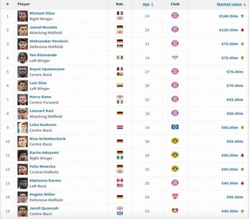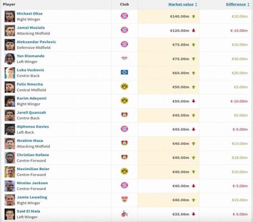 奥利塞以1.4亿欧身价领跑德甲,穆西亚拉1.2亿欧次之,帕夫洛维奇与扬-迪奥曼德以7500万欧的身价并列第三。
