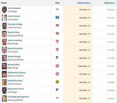 本期德甲有12名球员身价上涨超1000万欧,其中扬-迪奥曼德上涨3000万欧最多,武什科维奇2000万欧,勒沃库森队科法内上涨1800万欧,马扎上涨1500万欧,斯图加特队莱韦林与亨德里克斯均上涨1500万欧。