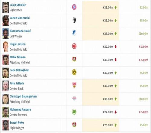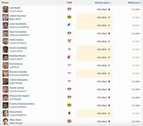 德甲部分球员身价变动情况