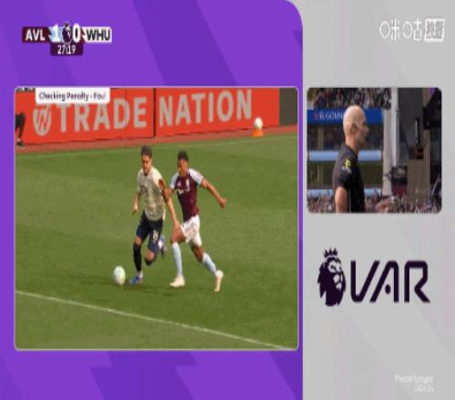 第27分钟,沃特金斯禁区倒地,裁判观看VAR后取消点球判罚