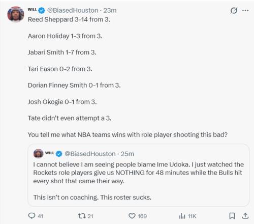 休媒:我不敢相信这场失利还有人喷乌度卡,我只看到火箭角色球员在48分钟里毫无作为,而公牛可以命中他们接到的球。这与教练无关,这轮换太糟糕了,泰特甚至都不敢出手三分,你告诉我哪支球队的角色球员这样的比赛能获胜?