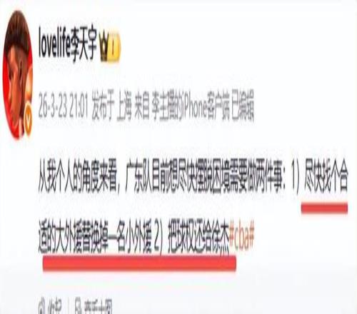 不过广东球迷对李天宇表示认可的同时,还补充了一条,他们调侃李天宇说,”博主还是没说真话“、“再加一件杜峰下课”,大家都说,只有杜锋下课才能解决问题,如果他还带队,再来高大的外援可能也没有用。他的用人让广东球迷伤心,好的不用,偏偏喜欢用那两个老寒腿(指18和25号)杜锋一天不离开广东队,球队的困境就不能摆脱。你们说呢?