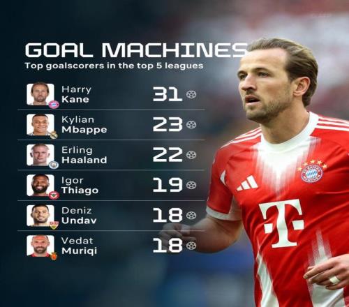 欧洲金靴最新排名:凯恩断层领跑!姆巴佩哈兰德苦笑,两黑马诞生