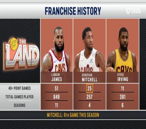 此役,米切尔还创下了两大纪录。第1、数据显示,这是米切尔本赛季第6场40+,骑士生涯第25场,队史第二,仅次于勒布朗詹姆斯的51场。