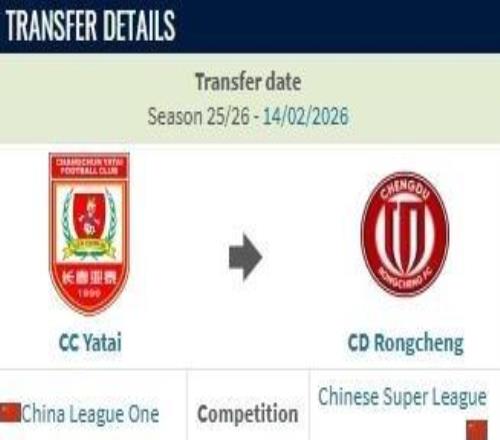 德转:贺一然从长春亚泰加盟成都蓉城的转会费约600万人民币