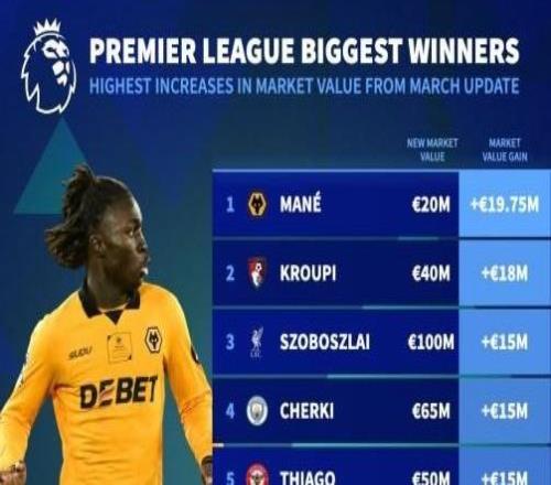 英超身价涨幅榜:索博斯洛伊上涨1500万欧达1亿,谢尔基上涨1500万欧