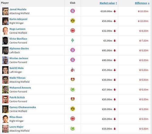 德甲球员身价跌幅榜:穆西亚拉、阿德耶米1000万欧居首