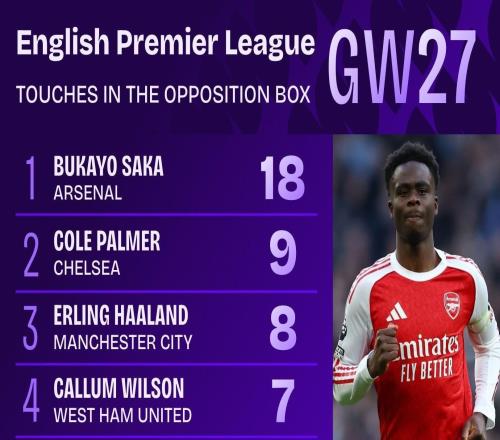 萨卡单场18次在对方禁区内触球,比热刺全队加起来多11次