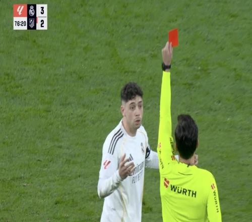 巧合,皇马西甲对阵马竞上一次有皇马球员被罚下也是32获胜