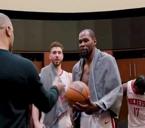 开心火箭全队给杜兰特泼水庆祝超越乔丹,乌度卡亲手送上比赛用球
