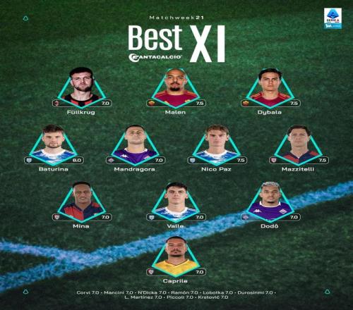 意甲第21轮最佳阵:迪巴拉、马伦、菲尔克鲁格、尼科帕斯入选